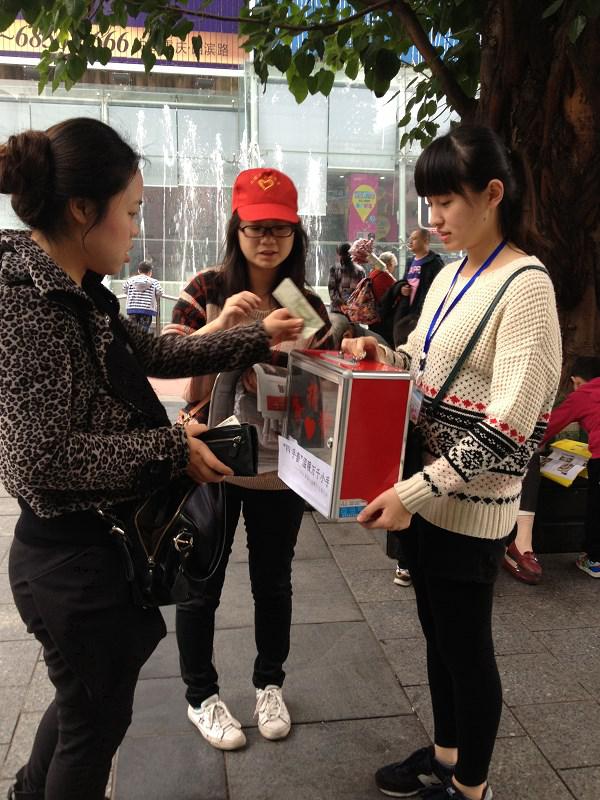 活动前会长将干部干事们分成六组分别在不同的地方进行义卖。活动期间干部干事们纷纷积极地向行走的路人推销报纸,阐述买这些报纸对贫困山区孩子们的重要性。虽然有的干事被拒绝多次,但干事们依旧以微笑去面对每个路人,耐心的向每个经过路人询问是否要献爱心。经过干事干部的不懈努力和广大市民的慷慨解囊,报纸在一份份的减少,爱心却在一点点的累积。相信这些贫困地区的孩子们也会越来越温暖,越来越幸福。
