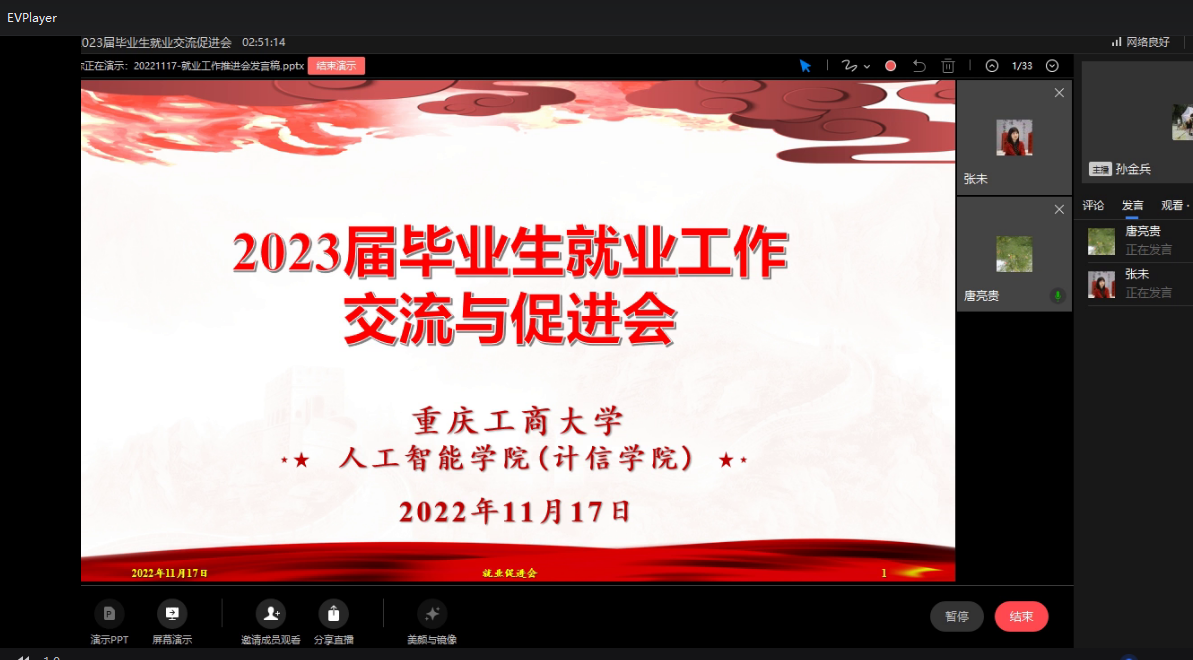 新冠肺炎疫情迁延反复使得我国高校毕业生就业形势更加严峻,对我国“稳就业”工作带来了巨大挑战。为贯彻“三全”促进毕业生就业创业的工作要求,2022年11月17日19时,Mksport体育在线上举办了勇往“职”前——2023届毕业生就业工作交流与促进会。公司党委书记何希平、经理唐亮贵、党委副书记张未、副经理杨光详、副经理秦华锋、就业联络员孙金兵、各专业教师、毕业班辅导员和2023届全体毕业生参加了本次会议,与会师生对当下的就业前景和状态分别进行了交流发言。