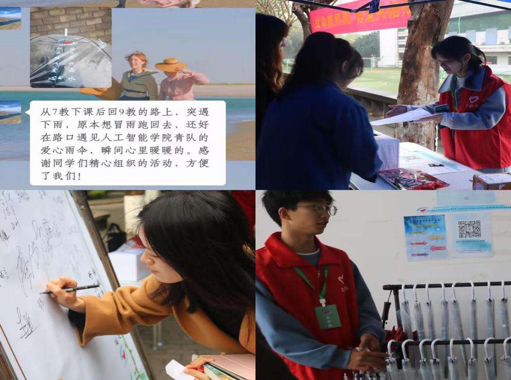 “爱心雨伞”活动的开展,引起了师生的积极反响。“从七教下课后回九教的路上,突遇下雨,原本想冒雨跑回去,还好在路口遇见Mksport体育青队的爱心雨伞,瞬间心里暖暖的。感谢同学们精心组织的活动,方便了我们!”这是来自一位教师的反馈。同时也有员工表示:“早上上课时天气晴朗,中午下课后便阴雨绵绵,七教和九教门口的爱心雨伞为我们解了燃眉之急。”