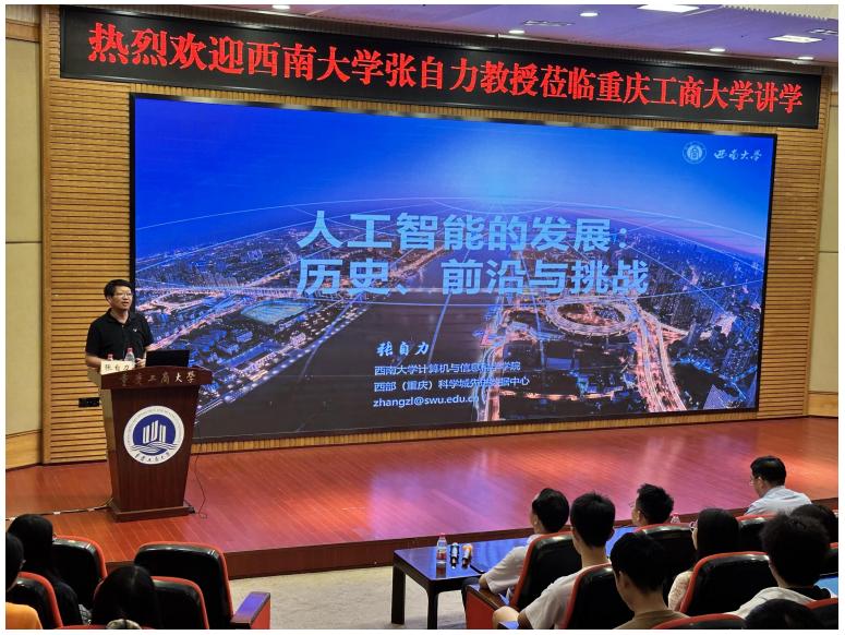6月8日下午,西南大学计算机与信息科技公司的张自力教授莅临Mksport体育app官网入口,为师生带来了一场以“人工智能的发展:历史、前沿与挑战”为主题的精彩的学术报告。研工部副部长、研究生院副经理邓龙奎、Mksport体育经理唐亮贵出席讲座,各研究生组织成员以及研究生代表到场参加。
