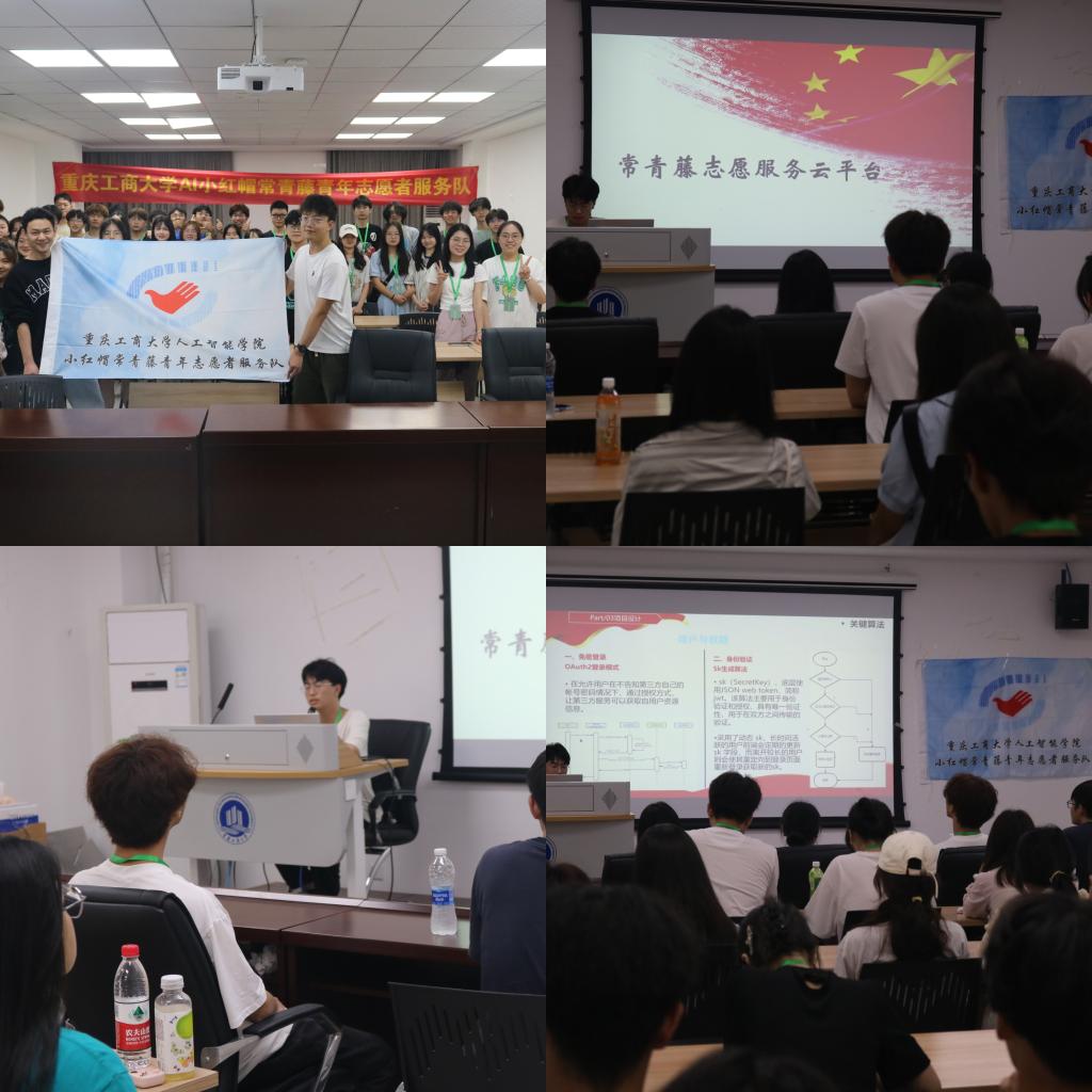 19:00,宣讲会正式开始,主讲人邓森围绕志愿云平台设计的初衷、功能和意义、云平台的项目设计等方面进行讲解,介绍在云平台上不仅可以进行志愿活动报名,还可以在云平台上点击“爱心雨伞”板块进行扫码借伞和还伞,也可以进行活动留言和相关意见反馈等。讲解过程中,主讲人与队员们积极互动,还向大家讲解了云平台设计所用到的前后端技术,队员们都表现出极大的兴趣。最后,主讲人带领大家一起现场操作,体验相关功能。20:10,青队队员们一起合影留念,此次活动结束。