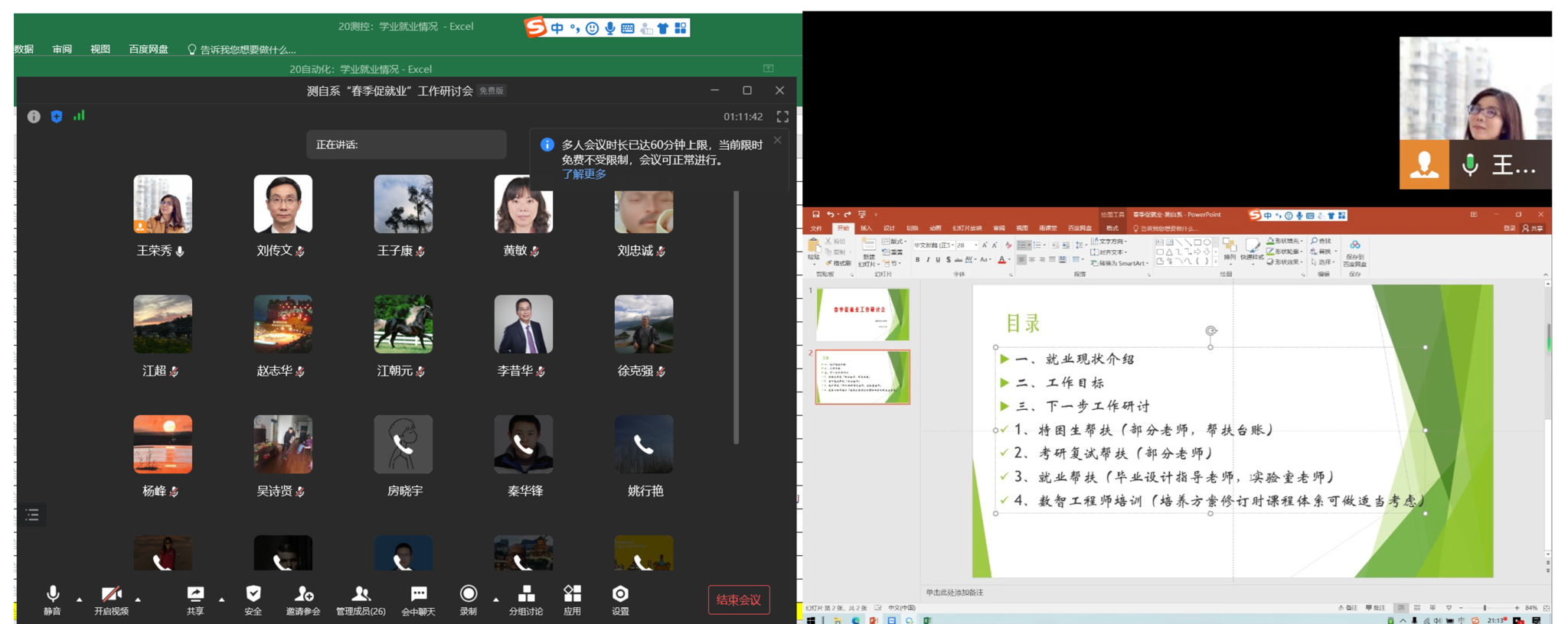 在对员工升学进行指导的基础上,晚上9:00,测控与自动化系在线上举办了一场春季促就业系部教师交流会议,专任老师们积极参与,共同探讨如何更好地支持员工就业需求。会上王荣秀主任对目前的就业情况进行了分享,并传达了公司为保就业所实施的举措,需要毕设指导老师、辅导员、员工联动,有针对性的对需要就业指导与帮助的同学进行帮扶,并建立帮扶台账进行状态的动态更新。曹怡老师作为测控与自动化系毕业班级的辅导员为老师们分析了目前员工们的就业状态与态度,并就个别同学的特殊情况与指导老师们进行沟通。会议上,各位专任老师纷纷发表讲话,强调了专业的就业前景和市场需求。他们表示将积极协助员工进行就业指导,提供最新的就业信息和岗位推荐,并为员工提供个性化的职业规划建议。王主任表示,公司和系部将一如既往地支持员工的就业工作,为他们提供更多的机会和资源。鼓励员工们积极参与就业指导活动,认真准备就业材料,提升自身综合竞争力,相信在老师们的指导下,员工们更有希望找到满意的工作岗位。