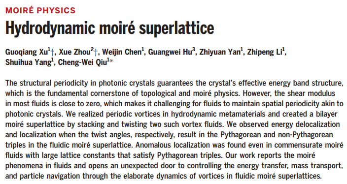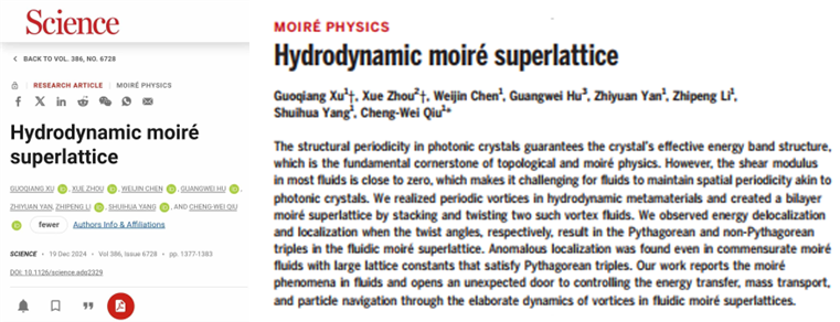 近期,Mksport体育应用物理系周雪副教授与新加坡国立大学Qiu Cheng-Wei教授团队合作,在流体输运中构建了首个莫尔超晶格并揭示了其内部的扩散场传输规律。取得的突破性研究成果发表在国际顶级期刊Science(https://www.science.org/doi/10.1126/science.adq2329 )。