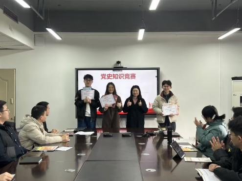 随后,开启了“党史知识竞赛”环节。此次竞赛设置了必答题、抢答题和风险题三种题型,题目内容紧密围绕党的发展历程、当下热点时事以及各类常识要点,难度从基础知识逐步提升。在必答题环节,党员同志们依据题目要求,认真思考、细致作答,充分展现了扎实的知识功底;抢答题环节,大家热情高涨、积极举手,现场气氛热烈,竞争异常激烈;风险题环节,同志们则谨慎决策,权衡利弊,既展现了智慧,也体现了勇于挑战的勇气。经过一番斗智斗勇,最终李祎同志凭借出色的表现拔得头筹,唐宇孝同志荣获第二名,刘栩源同志获得第三名。支部书记邹润玲为获胜小组颁发奖状,并与获奖党员同志合影留念。
