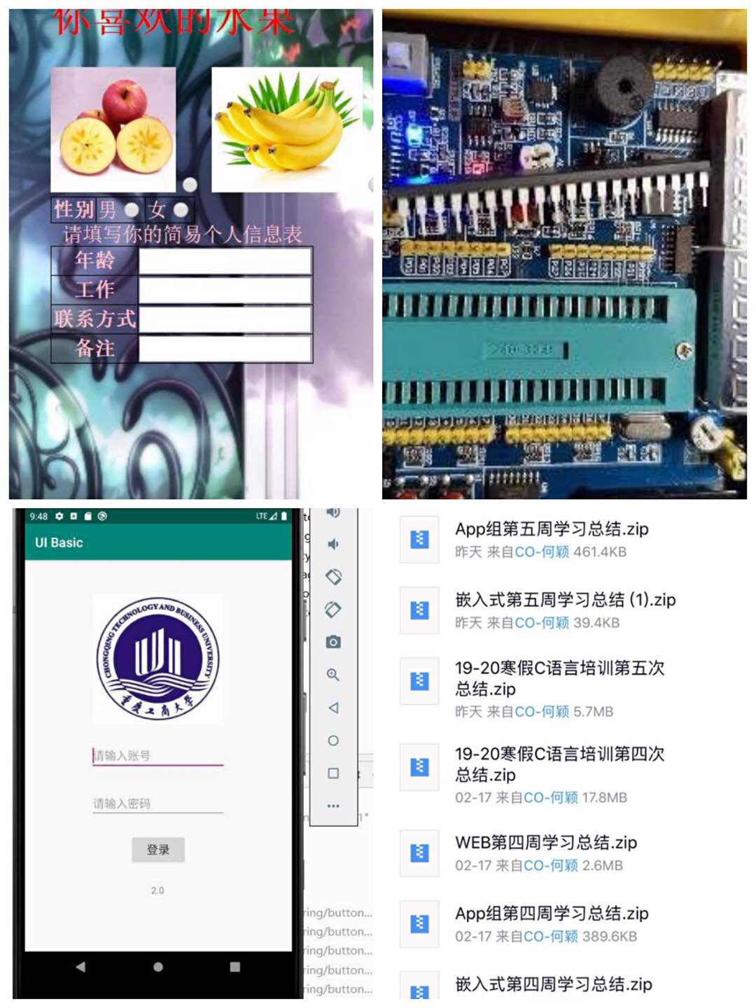 经过梁教授和CO科创团队骨干成员的精心指导和学员的自主学习,WEB组同学已基本掌握HTML5、CSS3、JS等语言,能够独立进行WEB前端的开发、网页登录界面的制作等;嵌入式组的同学对单片机已经入门,能运用所学知识写入程序、点亮LED灯、制作计时器、计数器、使用各类传感器等;APP组的同学对Android的知识体系有了进一步了解,能够在操作系统下利用final、static、string类等进行Android应用程序的开发;C语言组同学对基础知识已经全面掌握,能够熟练运用print函数、int整型等完成代码的敲写、模块化以及程序结构的设计。