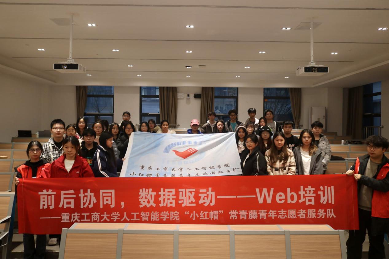活动结束后,全体参与者与志愿者们齐聚一堂,共同合影留念。镜头前,同学们的脸上洋溢着收获的喜悦和自信的笑容,背景中“前后协同,数据驱动——Web培训”的横幅格外醒目,成为了这次活动美好瞬间的永恒见证。