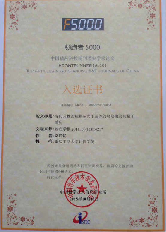 《物理学报》在2010-2014年内发表的4000多篇论文中提名34篇论文参加本年度的“领跑者5000”评选,其中刘启能教授的3篇论文入选,在《物理学报》排名第一。