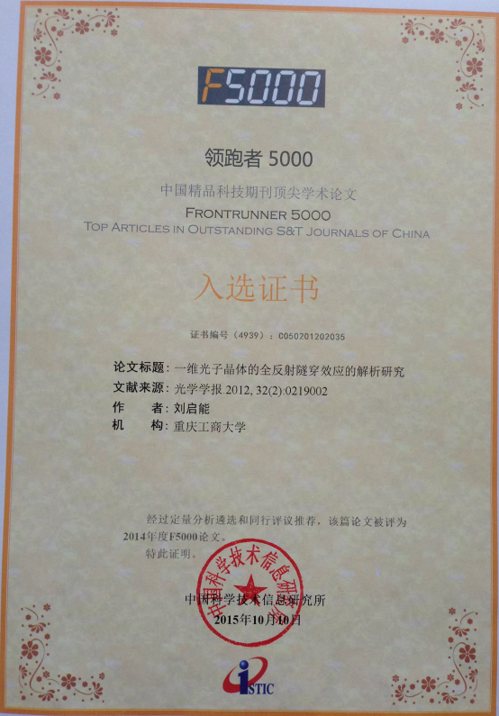 4刘启能,一维光子晶体的全反射隧穿效应的解析研究,《光学学报》,2012,32(2):0219002