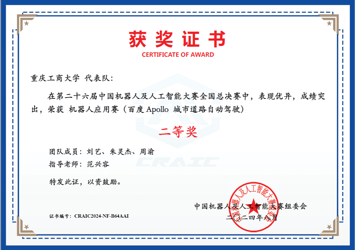 8月25日,第二十六届中国机器人及人工智能大赛全国总决赛在江苏宜兴成功举行。来自清华大学、哈尔滨工业大学、浙江大学等208所高校的407支队伍、1300余名选手,就自动驾驶、机器人、人工智能等领域的前沿技术展开激烈角逐和技术交流。此次盛会吸引了超过200位机器人与人工智能领域的专家学者、行业精英,共同探讨前沿技术与实际应用。在此次大赛中,Mksport体育AI机器人科创团队表现优异,在“百度Apollo城市道路自动驾驶”赛项中斩获全国二等奖(团队成员:刘艺、朱灵杰、周渝,指导教师:范兴容)。
