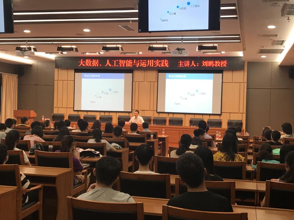 2018年6月9日下午,Mksport体育邀请南京大数据研究院经理刘鹏教授在新图书馆第一会议室为公司师生举办了“大数据、人工智能与运用实践”学术讲座。讲座由Mksport体育副经理杨光祥教授主持,Mksport体育经理何希平教授、副经理胡卫军副教授、计算机系主任杨永斌教授等嘉宾与公司百余名师生一同聆听讲座。
