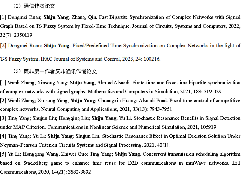[2].ShijuYang; Chuandong Li; Xiping He; Wanli Zhang. Variable-time impulsive control for bipartite synchronization of coupled complex networks with signed graphs. Applied Mathematics and Computation, 2022, 420: 126899(SCI,JCR Q1, TOP期刊)