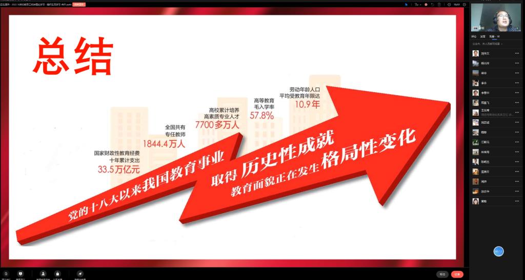 在“支部书记讲党课”环节,支部书记李明同志以“奋楫谋发展 砥砺铸辉煌——数字见证中国教育十年成就”为题与支部党员共同回顾了中国教育在过去十年取得的成就。通过一系列令人振奋、令人欣喜的数字,李明指出,在过去十年,我国的教育投入取得前所未有的成就、教师队伍实现量质齐升、学前教育取得跨越式发展、基础教育全面提质发展、现代职业教育体系向纵深推进、高等教育改革发展成效显著、劳动力素质结构发生重大变化。李明强调,教育是国之大计、党之大计。党的十八大以来,在以习近平同志为核心的党中央坚强领导下,我国教育事业取得历史性成就、发生历史性变革。数据记录历史,数据见证成就。从数据看“教育这十年”,我国教育面貌正在发生格局性变化。