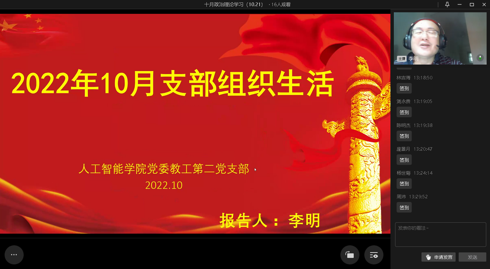 2022年10月21日Mksport体育教工二支部在企业微信以线上会议的方式开展十月份支部组织生活,活动由支部书记李明同志主持。