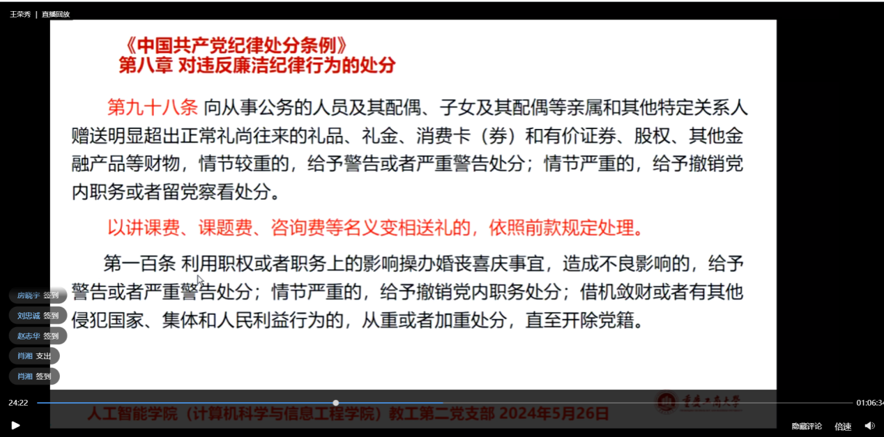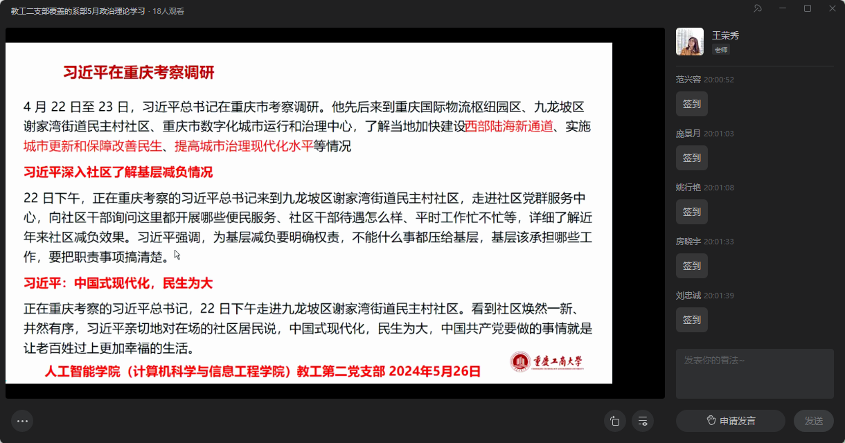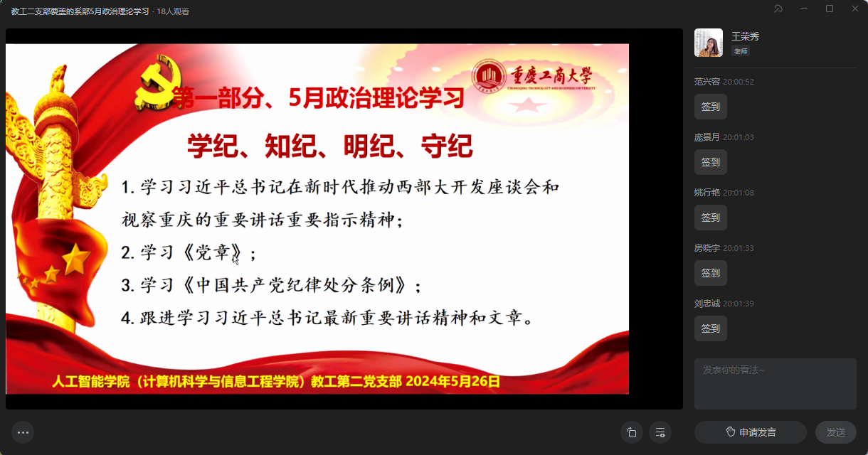 在直播中,王荣秀书记分享了对政治理论学习的理解和认识,她指出“作为高校教师,我们更应该加强政治理论学习,不断提升自身的政治素养,以更好地肩负起培养人才、传播知识、服务社会的重大责任。”随后,参会老师们热烈讨论了习近平总书记在新时代推动西部大开发座谈会和视察重庆的重要讲话重要指示精神,深入学习了党章和中国共产党纪律处分条例。