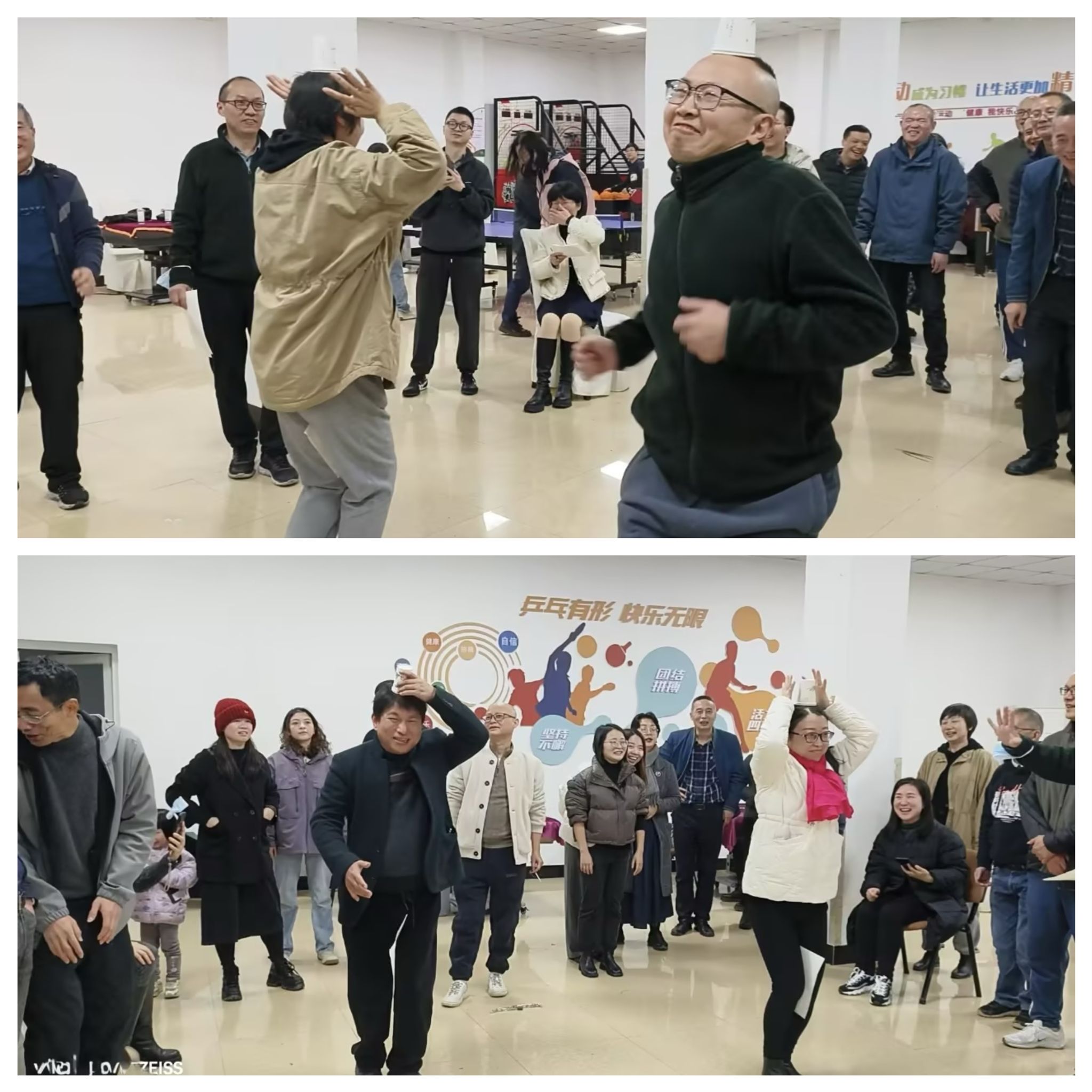 首先进行的是“A4纸运乒乓球”,比赛采用接力方式,团队两人一组,用A4纸将乒乓球运送到指定位置后返回将纸和乒乓球交给下一对队员,运送过程中纸要保持平坦,直至全部队员完成计时结束,用时越少积分越高。随着裁判员一声令下,两位老师小心翼翼用A4纸抬着乒乓球走向终点,由于纸不能折叠,要将乒乓球倒入纸杯里不容易,有时候4、5次都倒不进去,为了抓跑掉的乒乓,甚至把球桌都推动了,引得阵阵爆笑,欢乐的氛围弥漫在大厅。