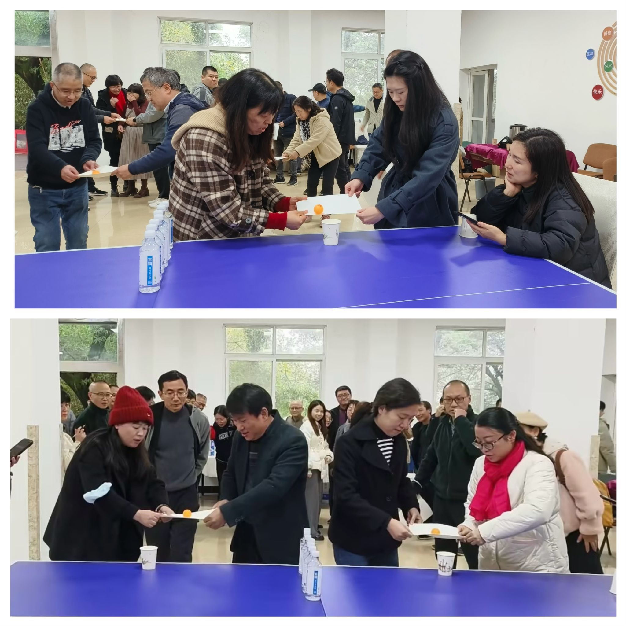 接下来的“投篮”“猜拳过河”,进球与丢球、划输与划赢,都伴随着喝彩声与惋惜声,笑意弥漫在每一张脸上。“龙行虎步”最有趣,因为两腿间夹着A4纸,头上还顶着纸杯,老师们接力时姿势表情各异,引得大家哈哈大笑。