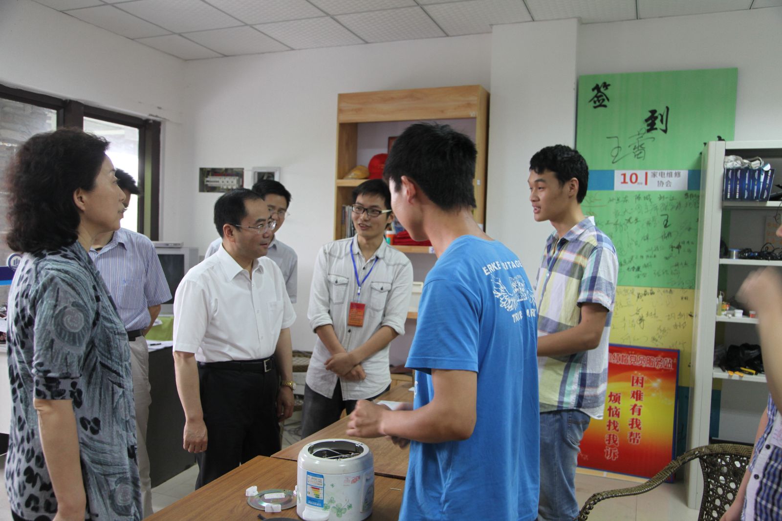 小红帽的同学们亲切的向吴刚副市长介绍了家协的历史、获得的荣誉以及日常维修的物品的情况。听完基本的介绍后,吴市长关切的询问了小红帽在日常维修中遇到的困难,并强调:“当代老员工更注重理论学习,而家协这样一个团体可以将理论联系到实际,为以后出身社会打下坚实的基础!”