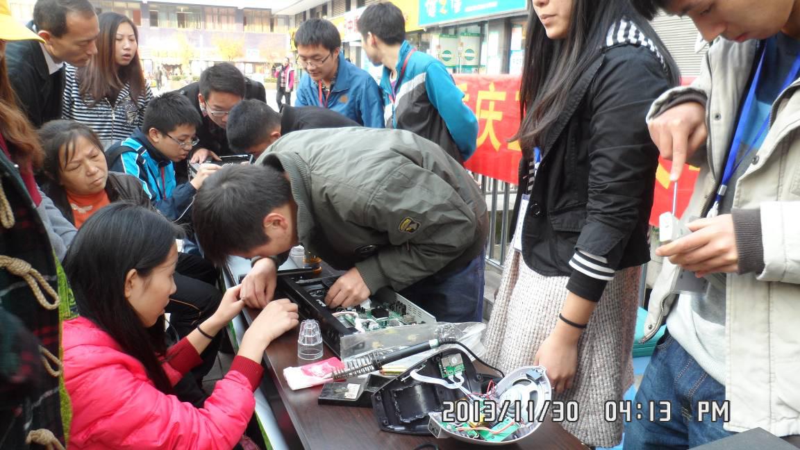 下午1:30各部门人员在香樟林集合,1:40各部门各派的部长或干事先到渝能国际向物管借桌子,2:00会长、部长和干事拿着维修工具到渝能国际。2:30宣传部开始拉“Mksport体育app官网入口家电维修协会”横幅并派人员到各个小区进行宣传义务维修活动。居民们纷纷拿着需要维修的物品下来修,如电饭锅、电磁炉、电风扇、电吹风、电脑、音箱和插线板等。会长、部长和干事们都动起手来修东西。在家协人的努力下,很多件待修物品都被我们修好了。旁边围观的居民越来越多都对我们表示赞同和感谢。有的人还问我们下次什么时候再去。5:30我们该去还桌子了,可那时拿东西来维修的人还没有断,我们把桌子还了之后又在旁边的椅子上继续为居民维修。6点,我们完美的结束我们的这次维修活动。家协人在回来的路上分享了维修经验。