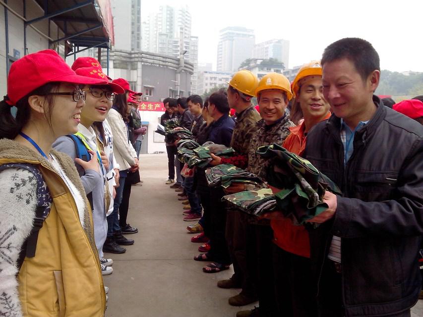 大概步行了十几分钟后,志愿者们到达了工地,这时候工地的工人们也下班了。会员们在会长的组织下整理队形,工人们也在相关负责人的指挥下站好了队形。志愿者们领到军服后,进行了一对一的送军服活动,并且和工人们唠了家常,志愿者们和工人之间并没有陌生感。军服送完之后,由工地的领导讲话。活动的最后,志愿者们和工人们合影留恋,记录下了这温暖的一刻。