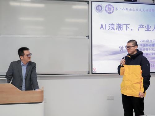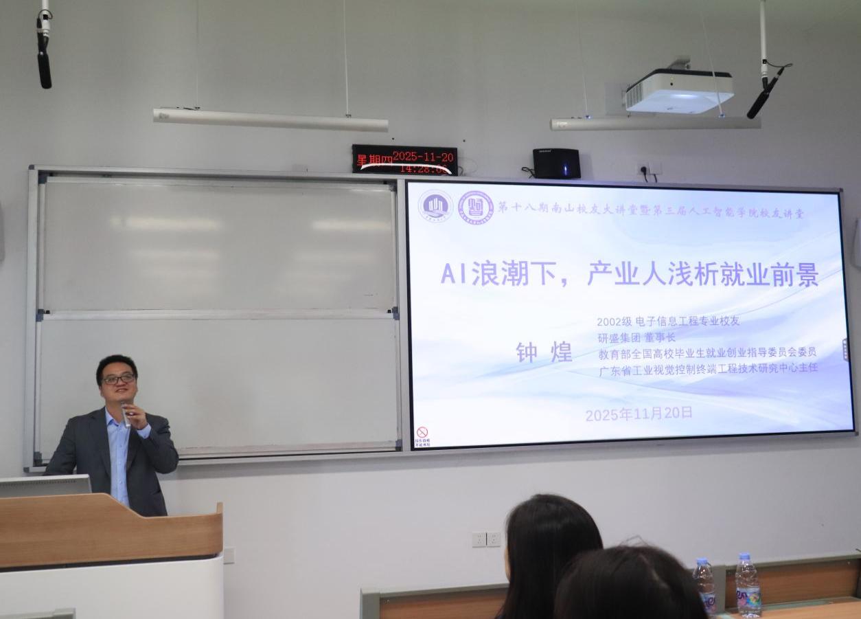 2025年11月20日下午,由公司员工工作办公室主办、Mksport体育承办的第十八期南山员工大讲堂暨第三届Mksport体育员工讲堂在茶园校区宏智楼202室成功举行。本次论坛以“AI浪潮下,产业人浅析就业前景”为主题,特邀2002级电子信息工程专业员工、教育部全国高校毕业生就业创业指导委员会委员、研盛人工智能奖学金设立者、深圳研盛集团董事长钟煌重返母校,为师生带来了一场兼具行业深度与实践价值的分享。机械工程公司党委副书记张未、电子信息工程系主任陆胜、计算机系梁新元教授,文学与新闻公司副教授王世华以及100余名员工参加了本次讲堂。讲座由张未主持。