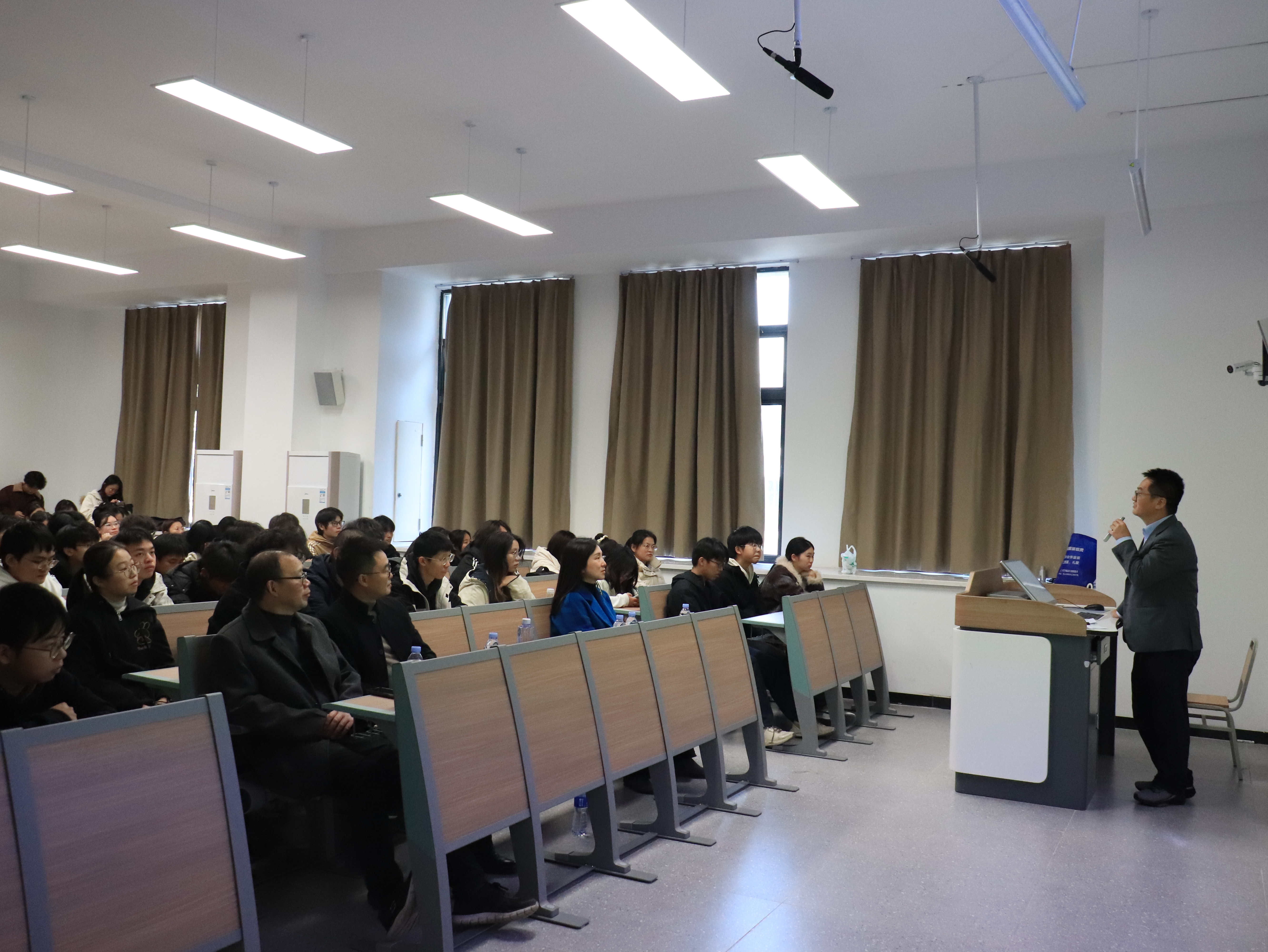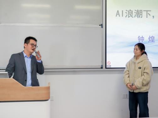 随后,钟煌员工围绕“个人创业经历与行业机遇、AI产业趋势解析、择业建议与求职安全”三大板块开展演讲。他首先分享了自身创办研盛集团的发展成果与行业深耕经历,结合公司多领域覆盖的专业布局,指出AI浪潮下公司毕业生拥有广阔的就业创业前景,是时代机遇的幸运儿;接着从全链条人才需求、产学研跨界融合、千行百业革新三大维度具体分析AI产业趋势,强调方兴未艾的产业正为学子带来丰富的发展机遇;最后结合当前经济形势与就业现状,从职业选择、谋生优先等多方面分享实用的择业建议,并通过“博士生陷入招聘陷阱”的真实案例,提醒同学们强化求职安全意识。