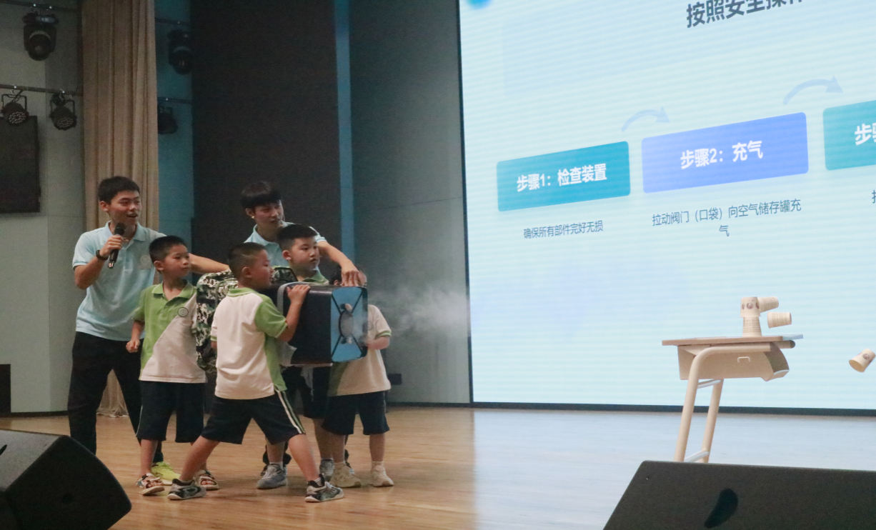 活动伊始,由大二、大三员工组成的科普团向员工展示自制的“空气大炮”,通过击落纸杯墙演示其功能。借助烟雾机,经空气大炮打出来的烟圈激发了现场小朋友的兴趣,大家欢呼雀跃,全场气氛达到高潮。随后,科普团详细阐释了空气大炮的工作原理,并结合生活实际,介绍了它的广泛应用场景。互动环节,同学们反响热烈,都想亲身体验空气大炮的威力,感受物理科学的魅力。最后,团队成员引导孩子们要积极传承科学家精神,热爱科学、追求真理,争做时代好少年。