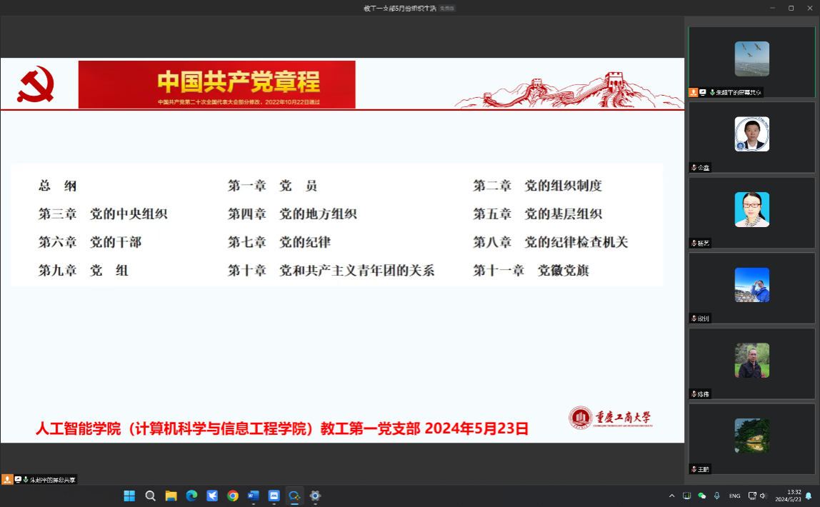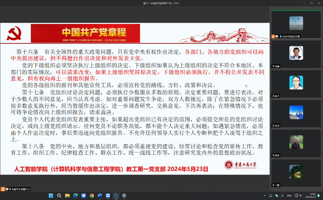 在组织生活的第二阶段,支部书记朱超平带领支部党员认真学习了中国共产党章程,强调了党的组织纪律。