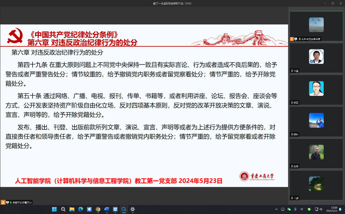 在组织生活的第三阶段,支部书记朱超平带领支部党员认真学习了《中国共产党纪律处分条例》,并以生动警示安全强调纪律在心、警钟长鸣的重要性。