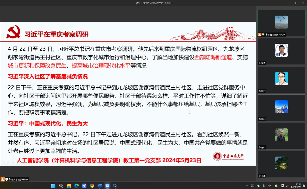 在组织生活的第一阶段,支部书记朱超平带领支部党员认真学习了习近平总书记在新时代推动西部大开发座谈会和视察重庆的重要讲话重要指示精神。学习了习近平总书记关于“推进城乡融合发展”、“推动西部大开发”、“推进城市治理现代化”等重要指示精神。习近平总书记指出:“重庆要以敢为人先的勇气,全面深化改革,扩大高水平对外开放。坚持和落实‘两个毫不动摇’,一手抓深化国企改革、培育一批核心竞争力强的国有企业,一手抓促进民营经济发展壮大、激发各类经营主体活力。积极融入全国统一大市场建设,主动融入和服务国家重大战略,在推动共建‘一带一路’、长江经济带、西部陆海新通道联动发展中发挥更大作用。主动对接高标准国际经贸规则,营造市场化法治化国际化一流营商环境。”在推动西部大开发座谈会上,习近平总书记指出:“党中央对新时代推进西部大开发形成新格局作出部署5年来,西部地区生态环境保护修复取得重大成效,高质量发展能力明显提升,开放型经济格局加快构建,基础设施条件大为改观,人民生活水平稳步提高,如期打赢脱贫攻坚战,同全国一道全面建成小康社会,踏上了全面建设社会主义现代化国家新征程。同时要看到,西部地区发展仍面临不少困难和挑战,要切实研究解决。”