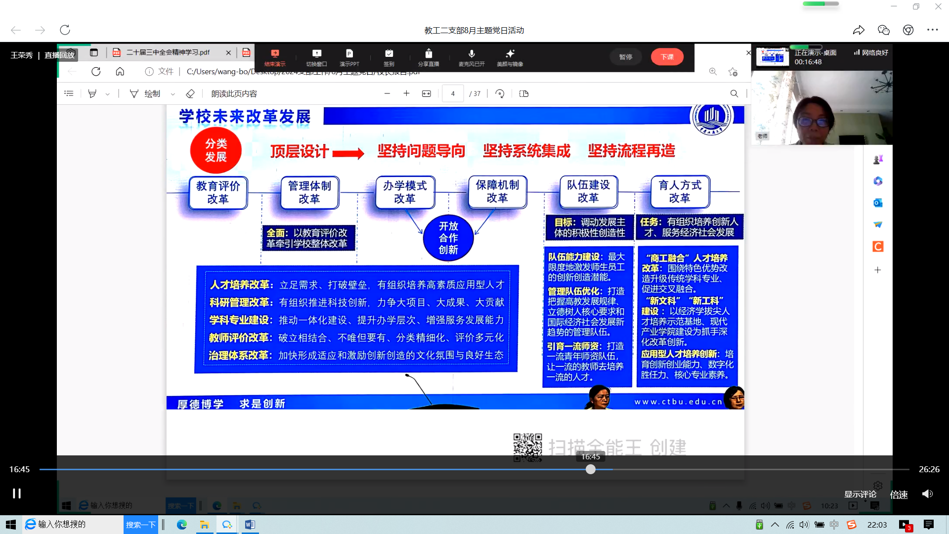 本次支部主题党日活动还组织老师们学习了8月30日温涛董事长《深化新时代教育评价改革,加快学科专业调整与优化》报告中的主要精神,温董事长号召大家抓住申博成功的机遇,以教育评价改革牵引公司整体改革,在管理体制改革,办学模式改革,保障机制改革,队伍建设改革,育人方式改革等方面正确取得更大的成绩。